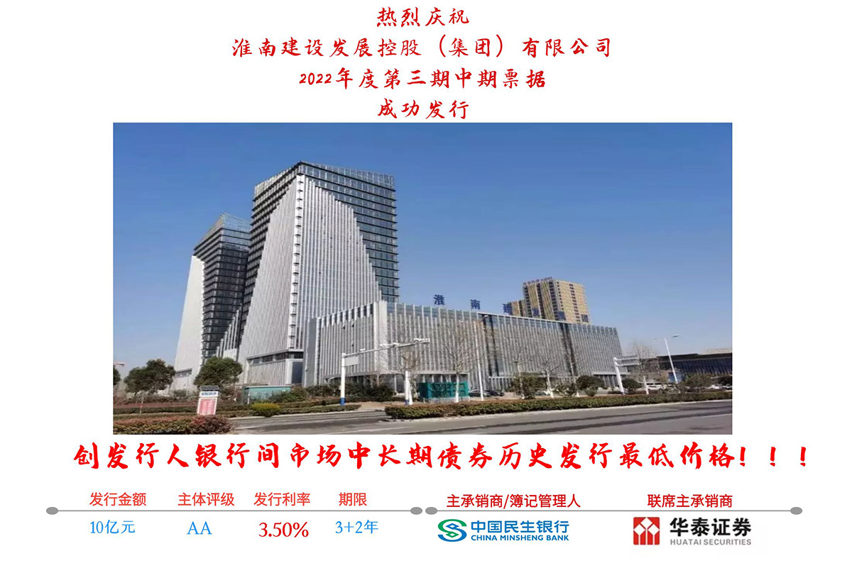 2022年7月21日,淮南建設(shè)發(fā)展控股(集團(tuán))有限公司2022年度第三期中期票據(jù)成功簿記發(fā)行,發(fā)行規(guī)模10億元。本期中期票據(jù)主承銷商為中國(guó)民生銀行,聯(lián)席主承銷商為華泰證券,簿記期間獲得眾多投資者的關(guān)注,全場(chǎng)認(rèn)購倍數(shù)2.3倍,最終票面發(fā)行利率3.5%,創(chuàng)淮南市市屬國(guó)有企業(yè)中長(zhǎng)期債券歷史新低。