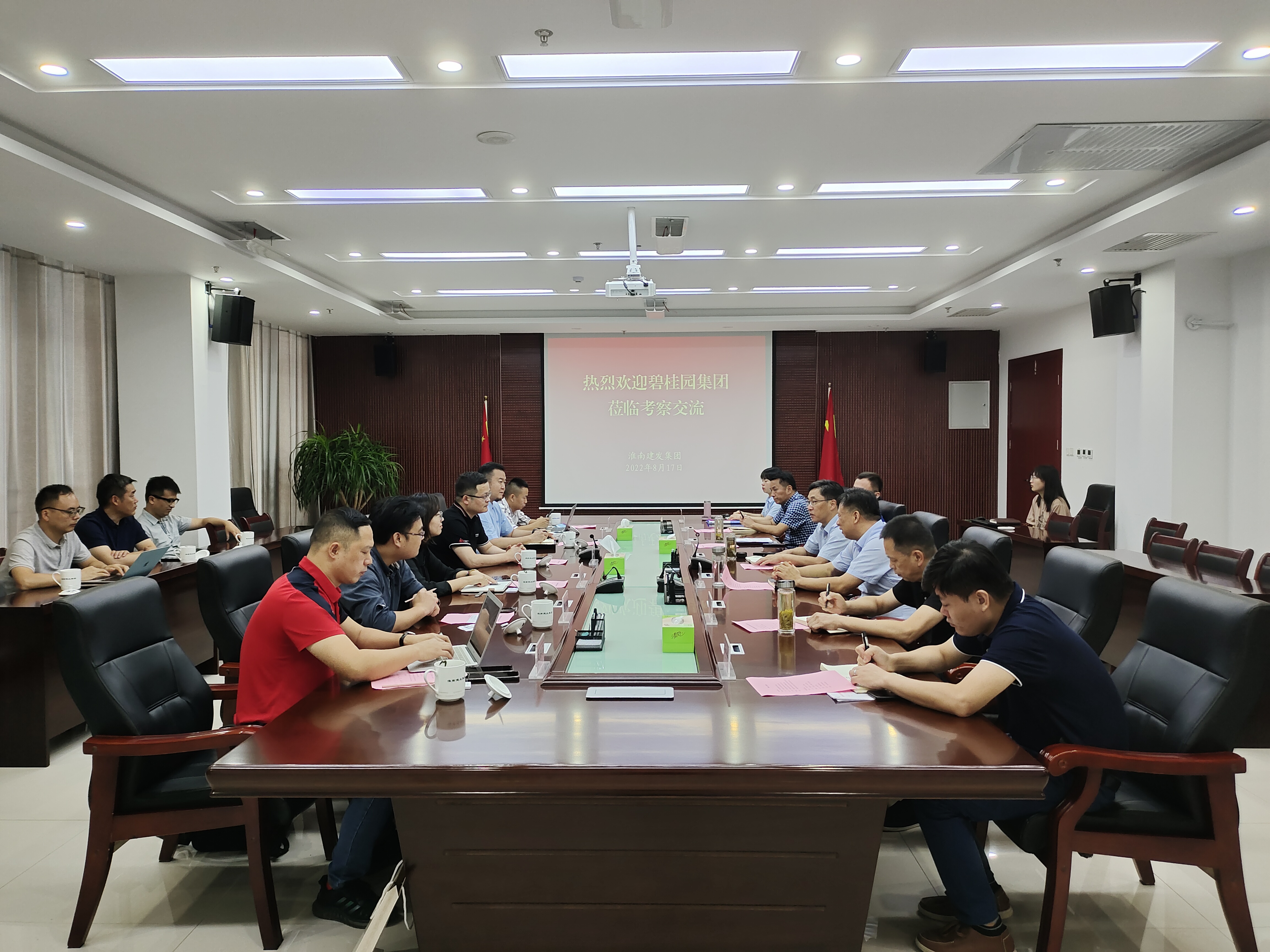 8月17日,碧桂園集團皖西北區(qū)域總裁錢劍勇、碧桂園集團鳳悅系品牌群執(zhí)行總裁吳小雄一行到訪淮南建發(fā)集團,集團公司黨委書記、董事長宋道河接待了來訪客商。雙方就淮南市城市基礎(chǔ)設(shè)施服務、房地產(chǎn)開發(fā)、文化旅游項目開發(fā)的合作、運營、投資等方面進行了深入交流。